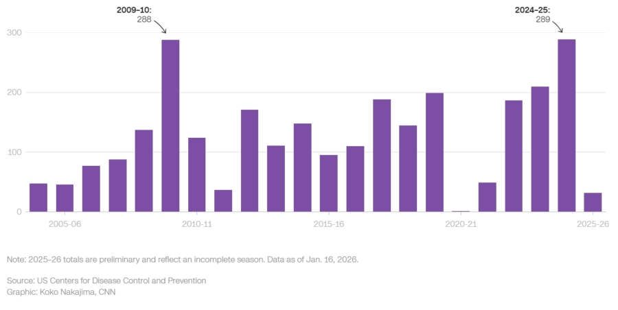 There have been 32 pediatric flu deaths so far this season. Last year’s flu season (2024-25) saw a record number of flu-related deaths among children — 289 — since states began reporting to the CDC in 2004.