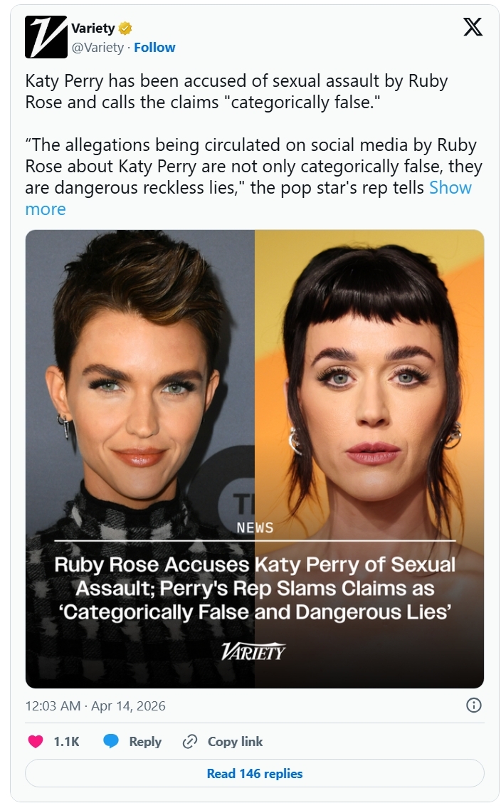 “The allegations being circulated on social media by Ruby Rose about Katy Perry are not only categorically false, they are dangerous reckless lies,” Perry’s rep told Variety. “Ms. Rose has a well-documented history of making serious public allegations on social media against various individuals, claims that have repeatedly been denied by those named.”