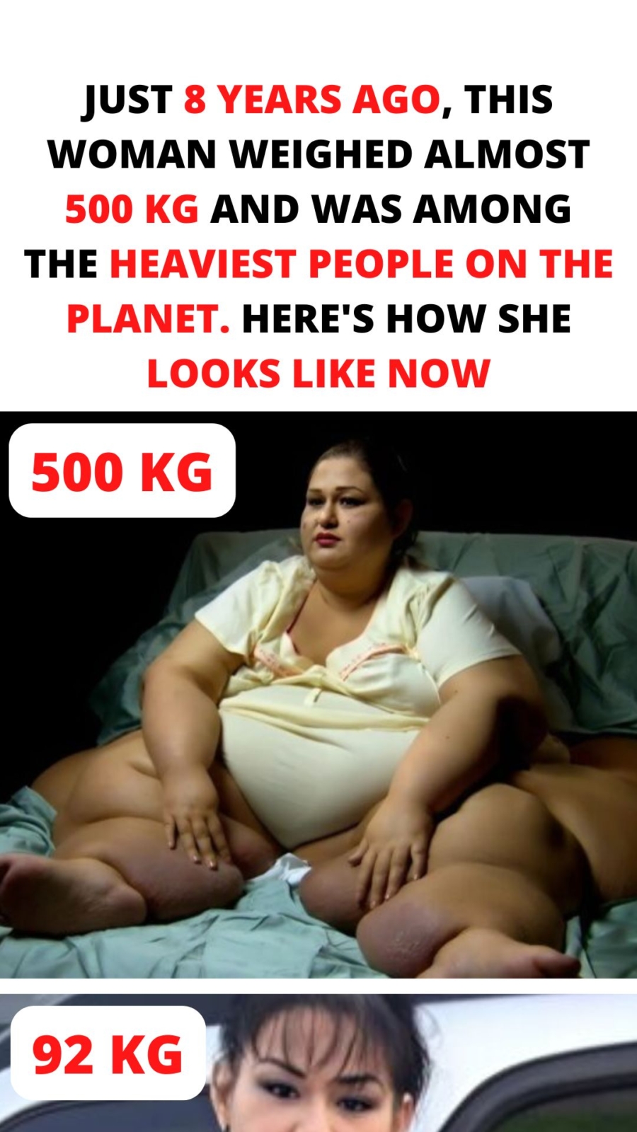Over the course of several years, Mayra lost more than 400 kilograms (approximately 880 pounds) — one of the most extreme and inspiring weight loss journeys ever recorded. From 500 kilograms, she dropped to just 92 kilograms (about 200 pounds). It wasn’t just a physical transformation — it was a complete rebirth.