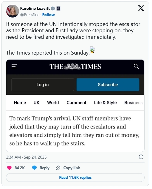 “If someone at the UN intentionally stopped the escalator as the President and First Lady were stepping on, they need to be fired and investigated immediately,” she wrote with a screen grab from a report from The Times on Sunday that U.N. staff joked about turning off the escalators.