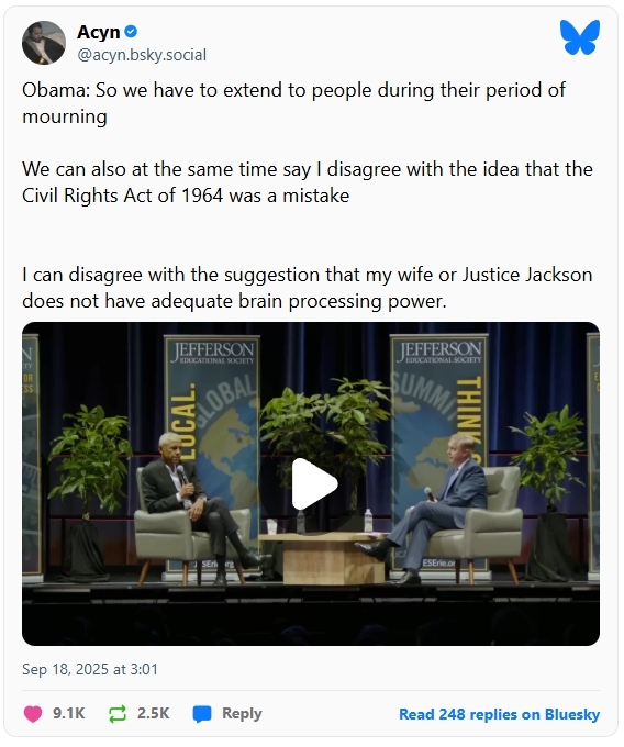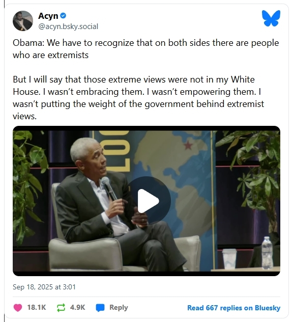 For good measure, the morning after the Trump administration helped force Jimmy Kimmel’s show off the air, Obama turned to Bluesky, writing: “After years of complaining about cancel culture, the current administration has taken it to a new and dangerous level by routinely threatening regulatory action against media companies unless they muzzle or fire reporters and commentators it doesn’t like.”