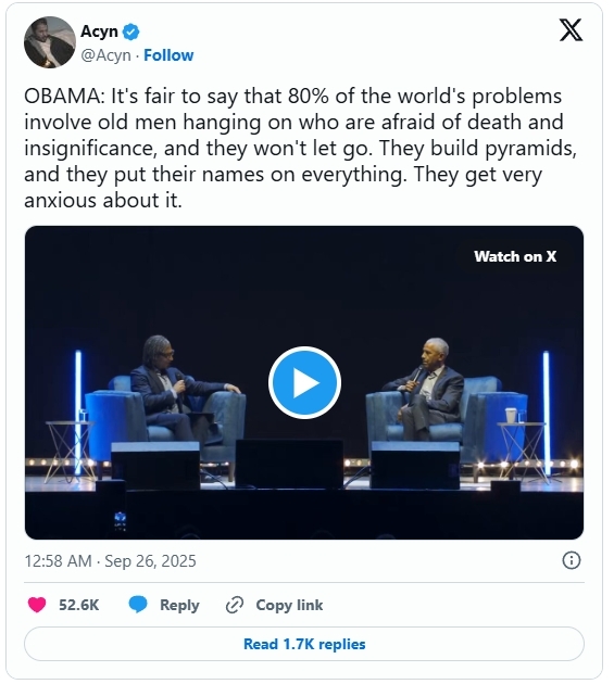 A video of former U.S. President Barack Obama saying, “It’s fair to say that 80% of the world’s problems involve old men hanging on, who are afraid of death, and insignificance, and they won’t let go,” circulated on social media in late September 2025. Social media users posted the video on sites like YouTube (archived) and Threads (archived). One X post (archived) of the video received nearly 3 million views.
