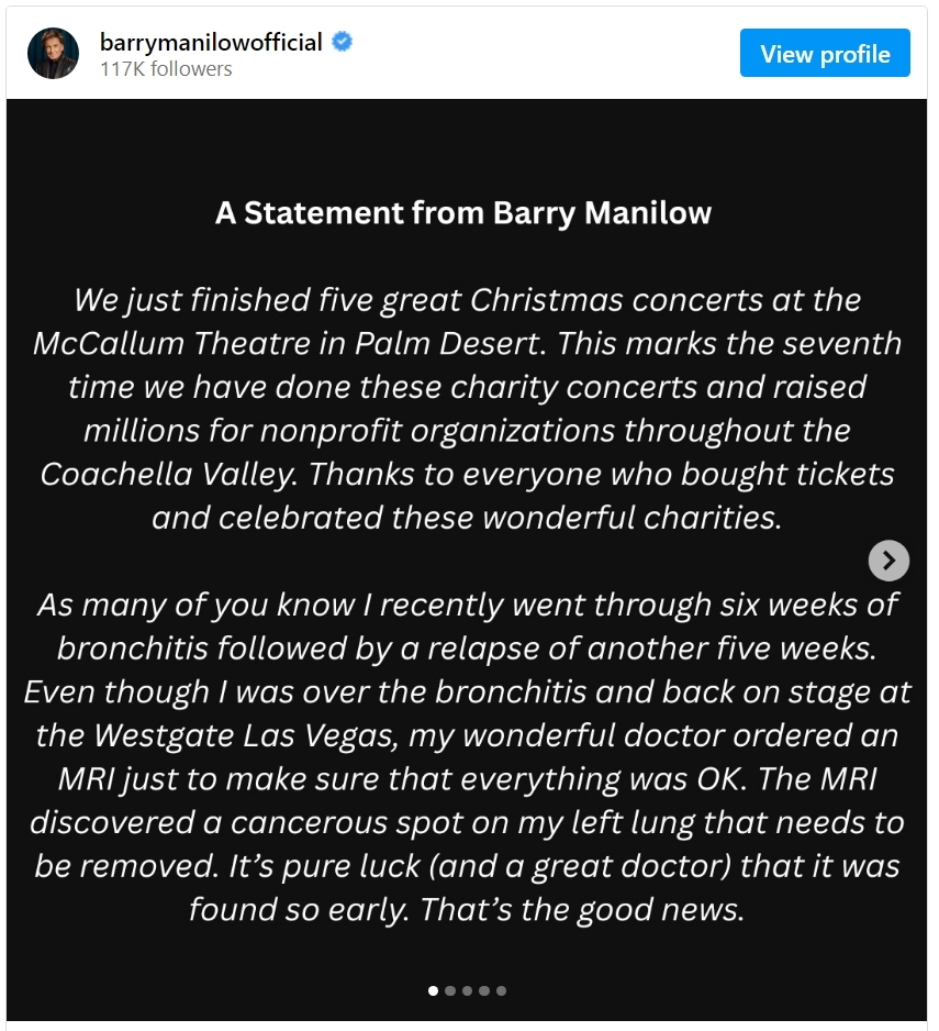 “The bad news is that after the Christmas concert A Gift of Love ends, I will have surgery to remove the point,” Manilow wrote, quoting the caption of an Instagram post, Wednesday, December 24.