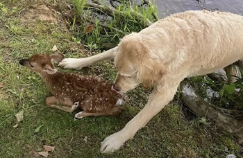 The fawn had been stranded in the middle of the lake, unable to return to shore. Without Harley’s timely intervention, the outcome could have been tragic. With gentle determination, Harley swam towards the struggling fawn, nuzzling the baby deer and offering comfort and reassurance. The fawn, clearly grateful for this unexpected lifeline, allowed Harley to guide her towards the safety of the shore.