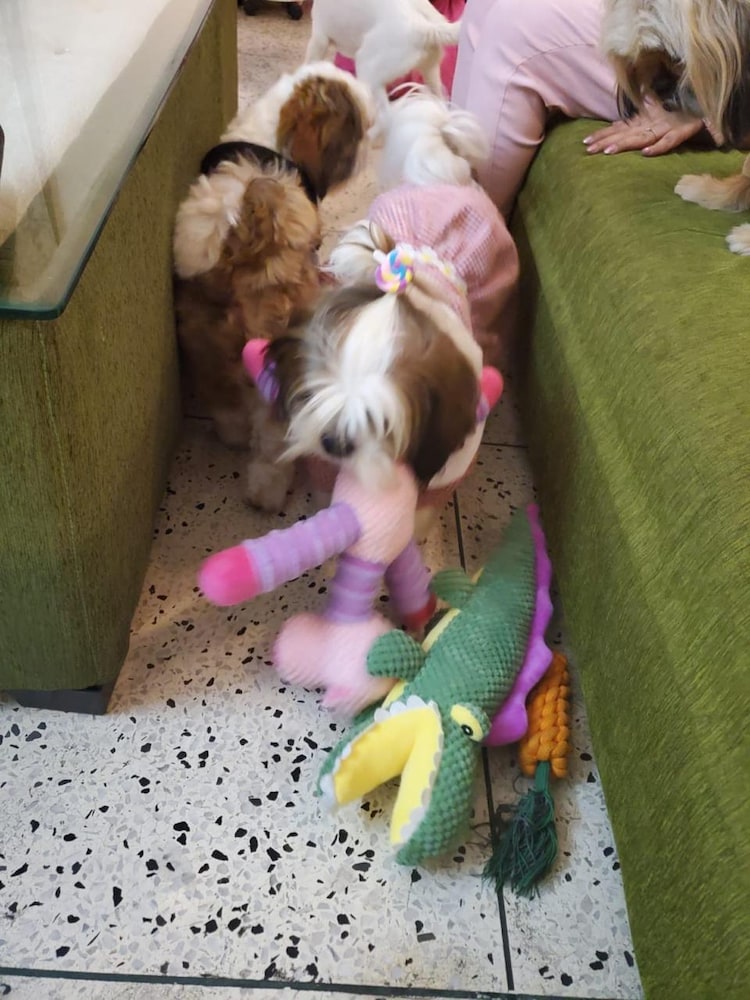 Once the greetings were exchanged, belly rubs were in place, and the dogs decided it was playtime. While they enjoyed running around with plushes and toys, we humans tried to keep things under control. Doggie etiquette 101.