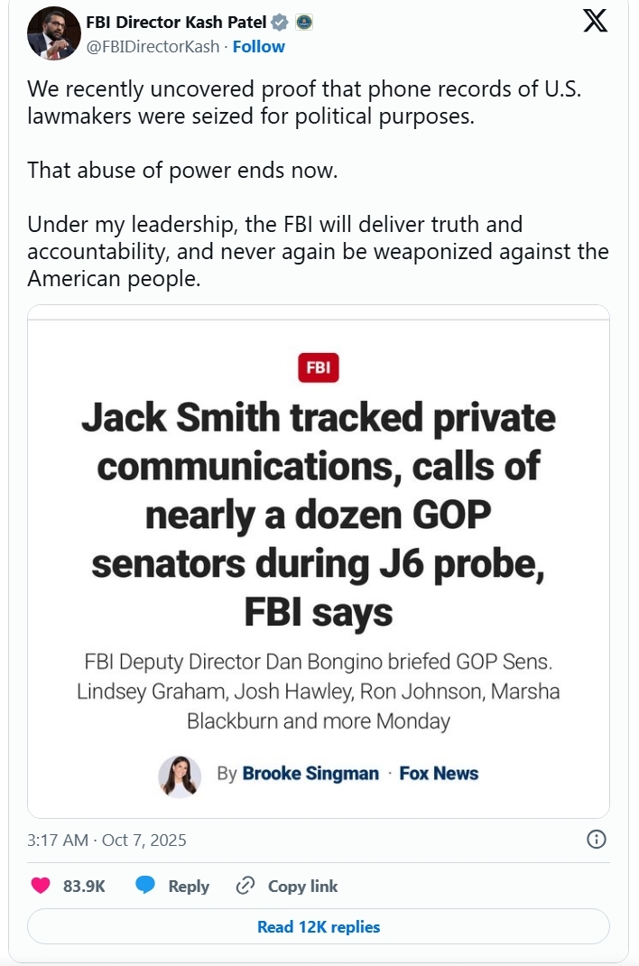 Patel confirmed the legitimacy of the findings in an X post, writing, “We recently uncovered proof that phone records of U.S. lawmakers were seized for political purposes.”