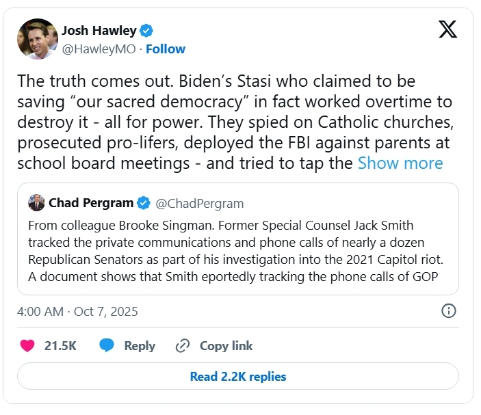 Several of the senators who had allegedly been spied on spoke at a subsequent press conference with Grassley and made statements on their respective social media pages, with Hawley calling Smith’s actions an “abuse of power beyond Watergate, beyond J. Edgar Hoover, one that directly strikes at the Constitution, the separation of powers, and the First Amendment.”