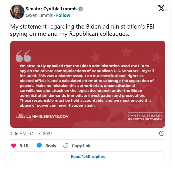 Lummis called the surveillance an “attack on the legislative branch under the Biden administration” that demands “immediate investigation and prosecution.”