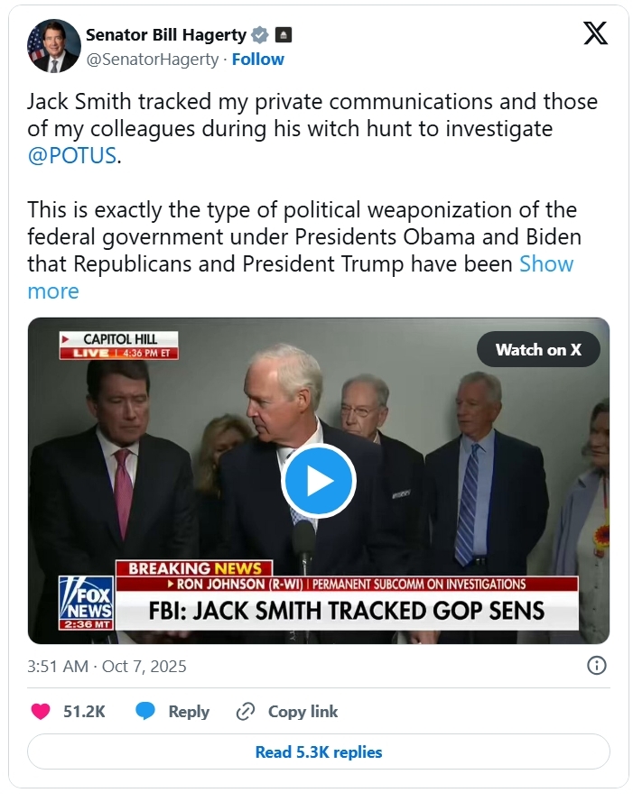 FBI: Jack Smith, Biden DOJ Tracked Phone Calls of GOP Senators, Congressman