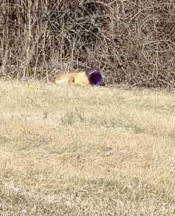 The week of Valentine’s Day, reports started flooding GPG’s phoneline of a stray dog roaming the streets of East St. Louis with a purple bucket on his head.