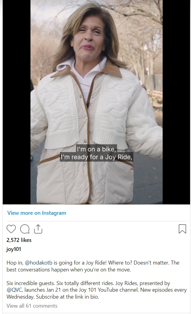 The message continued, “Six incredible guests. Six totally different rides. Joy Rides, presented by @QVC, launches Jan. 21 on the Joy 101 YouTube channel. New episodes every Wednesday. Subscribe at the link in bio.”