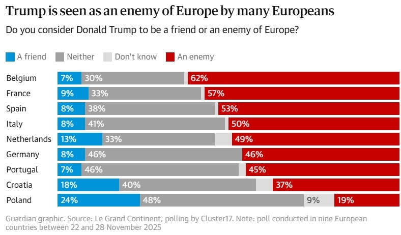 “Across the continent, Trumpism is clearly considered a hostile force,” Dormagen said, adding that this perception was hardening, with fewer people than in December 2024 describing Trump as “neither friend nor foe” and more as definitely hostile.