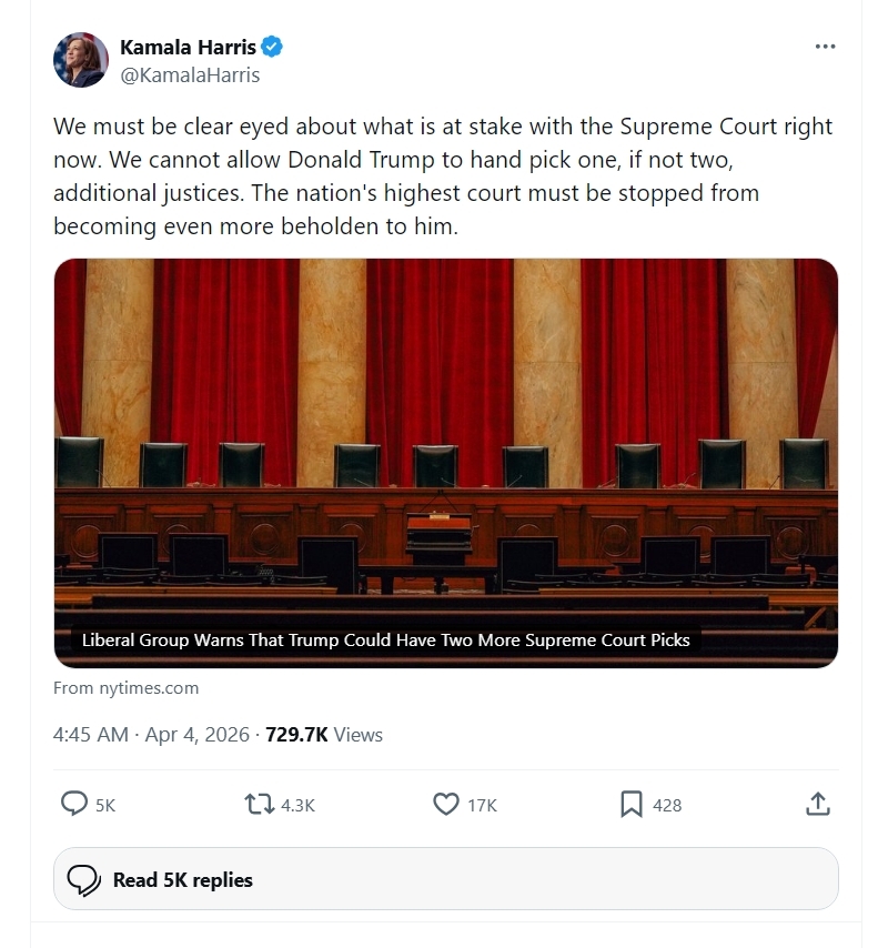 In a post on X, Harris — who lost the 2024 Presidential election against Trump, shared an article from the New York Times about how a “liberal organization” was “preparing a multimillion–dollar effort to oppose potential Trump Supreme Court appointees before they happen.”