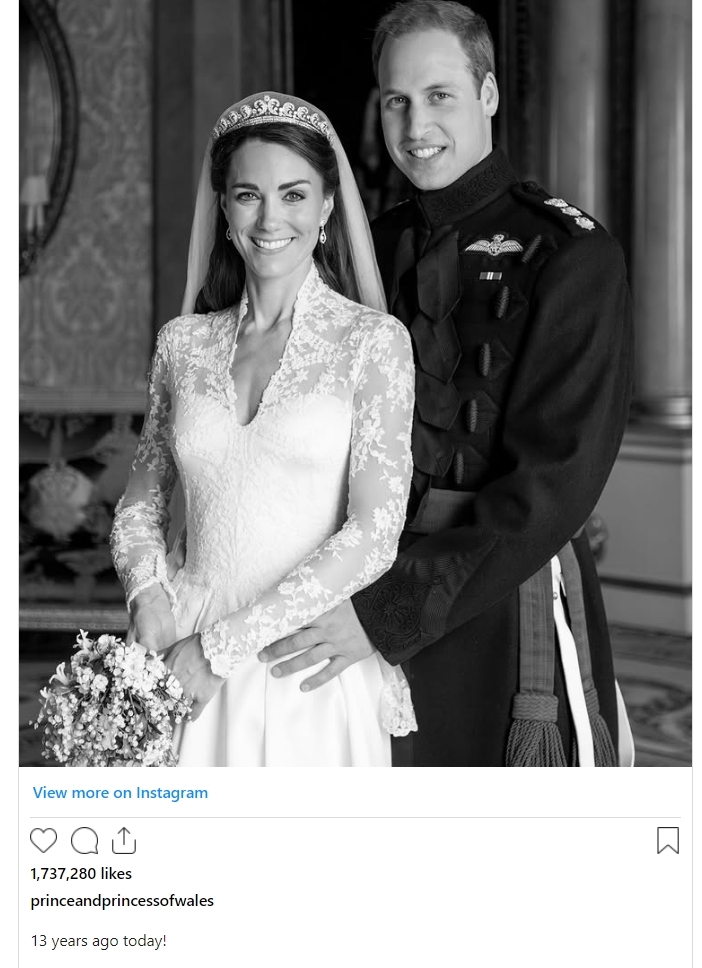 Sharing a new, never-before-seen photo from their 2011 wedding at Westminster Abbey, Prince William and Kate Middleton privately celebrated 13 years as husband and wife