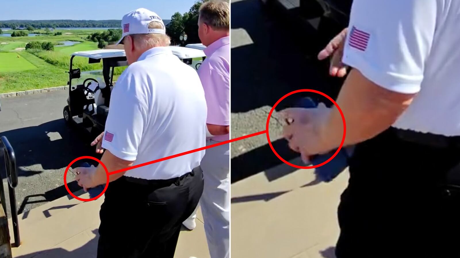 At one point, as the camera pans to Trump overlooking his course, the back of his left hand comes into view, showing a dark discoloration nearly identical in placement to the one on his right hand.