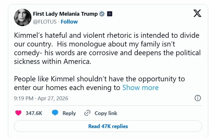 The days-old Kimmel joke emerged on social media following the Saturday shooting incident at the White House Correspondents’ Dinner. Last week, during Thursday’s episode of Jimmy Kimmel Live!, the host parodied the dinner in advance, delivering his own alternative comedy monologue as the event’s MC. Among the gags, Kimmel joked that Melania had the glow of an “expectant widow.”
