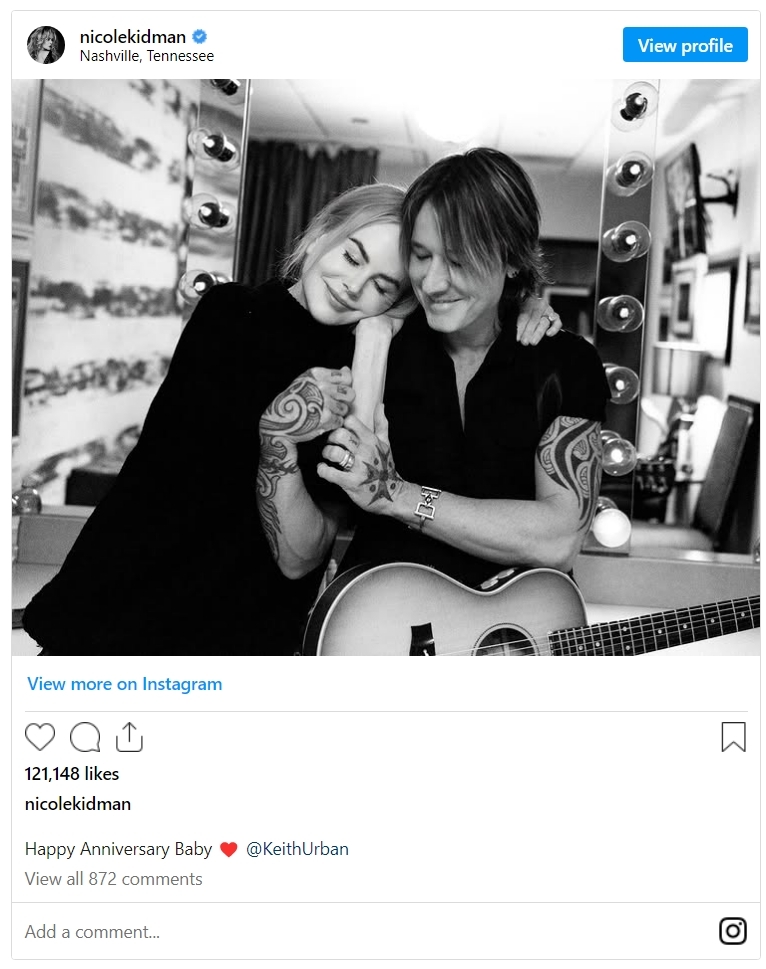 On June 25, Kidman shared a photo of herself cuddled up to Urban on Instagram to commemorate their wedding anniversary. “Happy Anniversary Baby ❤️ @KeithUrban,” she wrote.