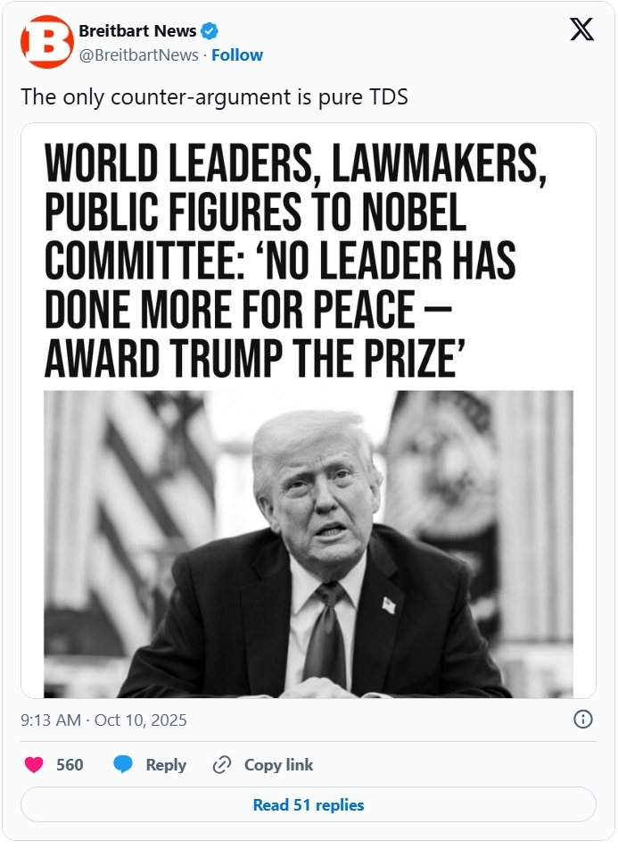 Trump said previously it would be an “insult” to the United States if he did not win the Nobel Peace Prize and he has been backed in his quest by a host of other nations, as Breitbart News reported.
