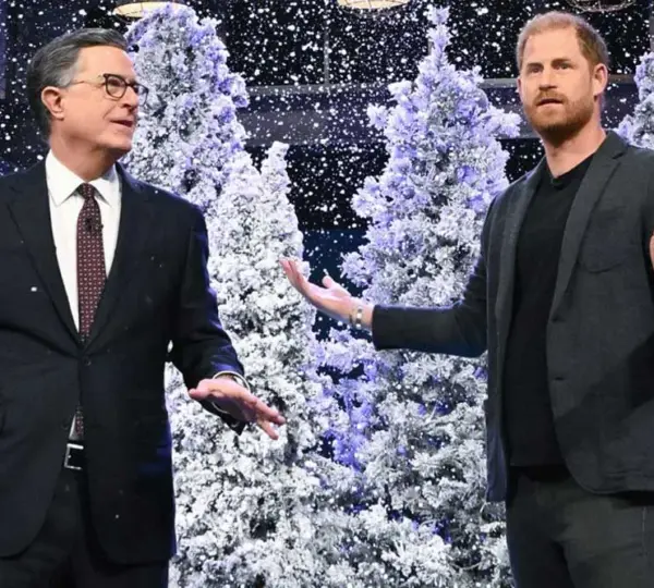 Colbert crowned Harry “The Late Show Prince of Christmas” amid falling fake snow, but the satire’s edge had already made its mark. (KTSA)
