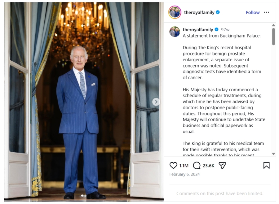 The king first revealed the news to the public after undergoing a routine procedure at a hospital in February 2024. At that time, Buckingham Palace released a statement: “During the king’s recent hospital procedure for benign prostate enlargement, a separate issue of concern was noted. Subsequent diagnostic tests have identified a form of cancer. His Majesty has today commenced a schedule of regular treatments … Throughout this period, His Majesty will continue to undertake State business and official paperwork as usual.”