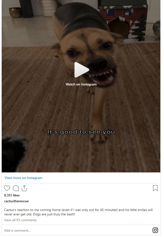 Michael regularly shares his “day to day life with Cactus” on the handle @cactustherescue. This video, for example, shows all the emotions a rescue puppy goes through once his dad is home, even giving him a sweet smile. He shows off a scrunched-up grin that would convince you that he hasn’t seen his human in years.