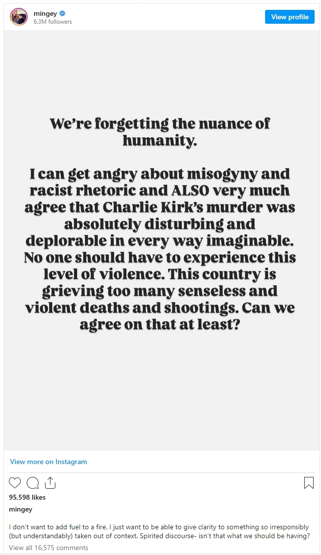 The comment obviously gained a lot of attention, and a couple of days later, Amanda followed up by providing some extra context in a longer statement posted to her Instagram page. “We are forgetting the nuance of humanity,” she wrote. “I can get angry about misogyny and racist rhetoric and ALSO very much agree that Charlie Kirk’s murder was absolutely disturbing and deplorable in every way imaginable. No one should have to experience this level of violence. This country is grieving too many senseless and violent deaths and shootings. Can we agree on that at least?”
