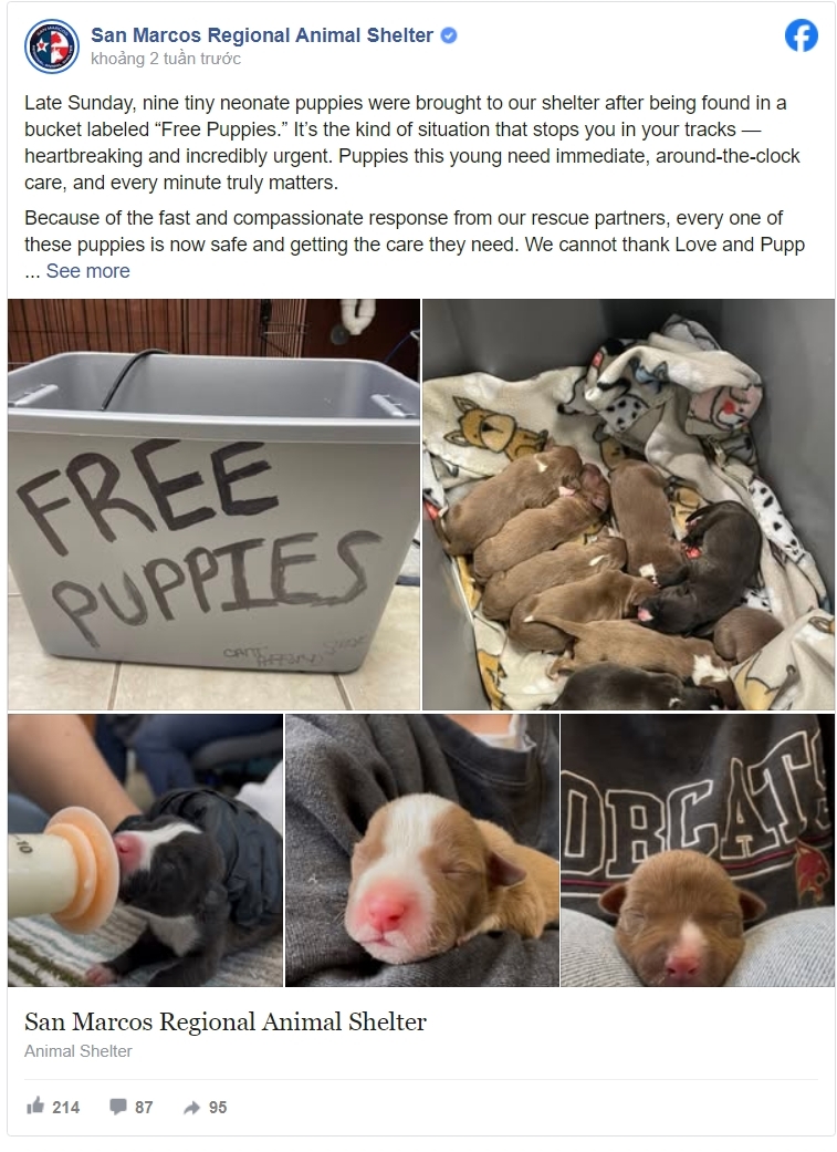 - The San Marcos Regional Animal Shelter in San Marcos, Texas, received nine newborn puppies that were found in a large tub labeled “Free Puppies”