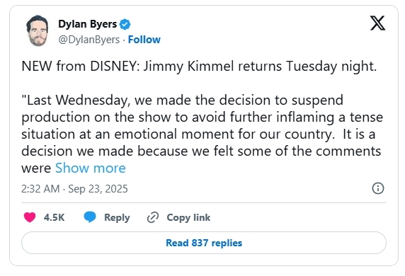 In the wake of Kimmel’s false claim, two of ABC’s largest affiliates, Nexstar and Sinclair, decided not to air Kimmel, leading to Disney and ABC’s decision to suspend the show.