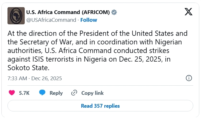 “At the direction of the President of the United States and the Secretary of War, and in coordination with Nigerian authorities, U.S. Africa Command conducted strikes against ISIS terrorists in Nigeria on Dec. 25, 2025, in Sokoto State,” the post read.