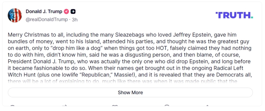 JUST IN: Trump Posts Ominous Christmas Message Savaging Democrats who Visited Epstein Island – “Enjoy What May be Your Last Merry Christmas!”
