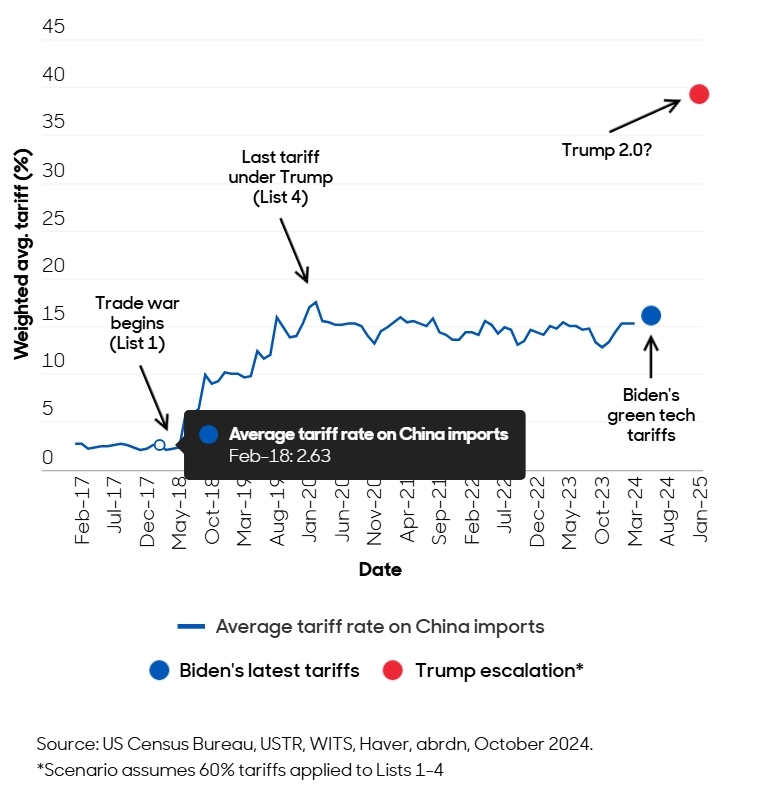 Chart 2. Tariffs facing Chinese exports are likely to more than double as a second trade war unfolds