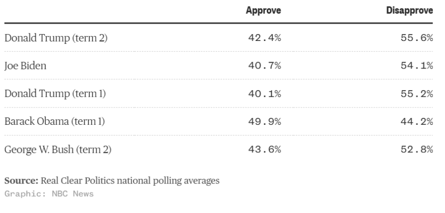 Meager numbers, of course, were a feature of Trump’s first term as well. He’s a polarizing figure who has never amassed broad popularity; only rarely across both terms has his approval average ticked above 50%. A large segment of the electorate — well over 40% — seems locked in against Trump, while another large chunk is locked in for him.