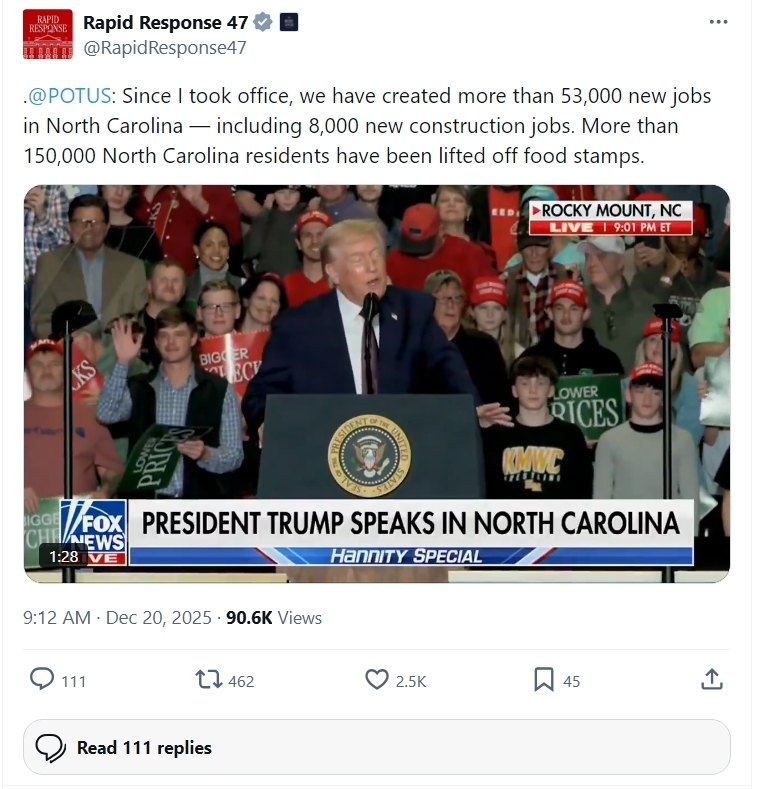 President Donald Trump touted strong economic numbers, including new jobs and over 150,000 lifted off of food stamps, while delivering remarks in Rocky Mount, North Carolina, en route to Mar-a-Lago for Christmas.