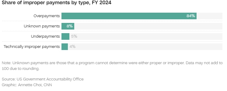 Overpayments, including payments to deceased individuals or those no longer eligible for government programs, made up the majority of the nearly $162 billion in payment errors in fiscal year 2024.