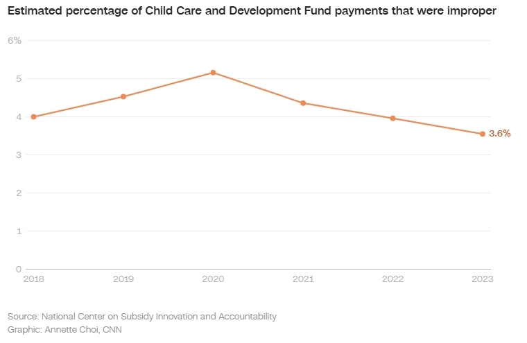 Child care: An estimated 3.6% of payments from the Child Care and Development Fund grant program were improper in 2023, according to a report from the Office of Child Care’s National Center on Subsidy Innovation and Accountability. About 39% of the improper payments were due to missing or insufficient documentation, including paperwork verifying income, work and residency.