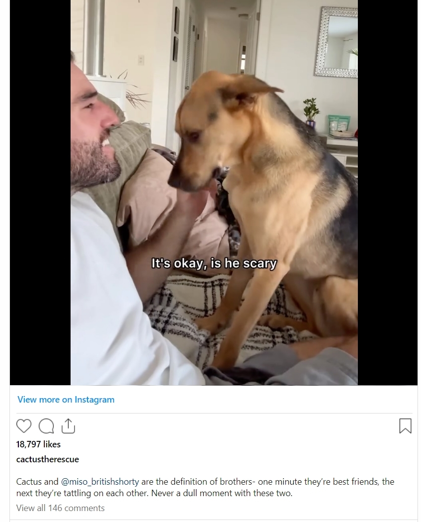 Sibling rivalry isn’t just for humans, as proven by this viral video of a rescue pup named Cactus and his feline brother, Miso. Posted on Instagram by @cactustherescue, the post’s caption reads, “Cactus and @miso_britishshorty are the definition of brothers — one minute they’re best friends, the next they’re tattling on each other. Never a dull moment with these two.”