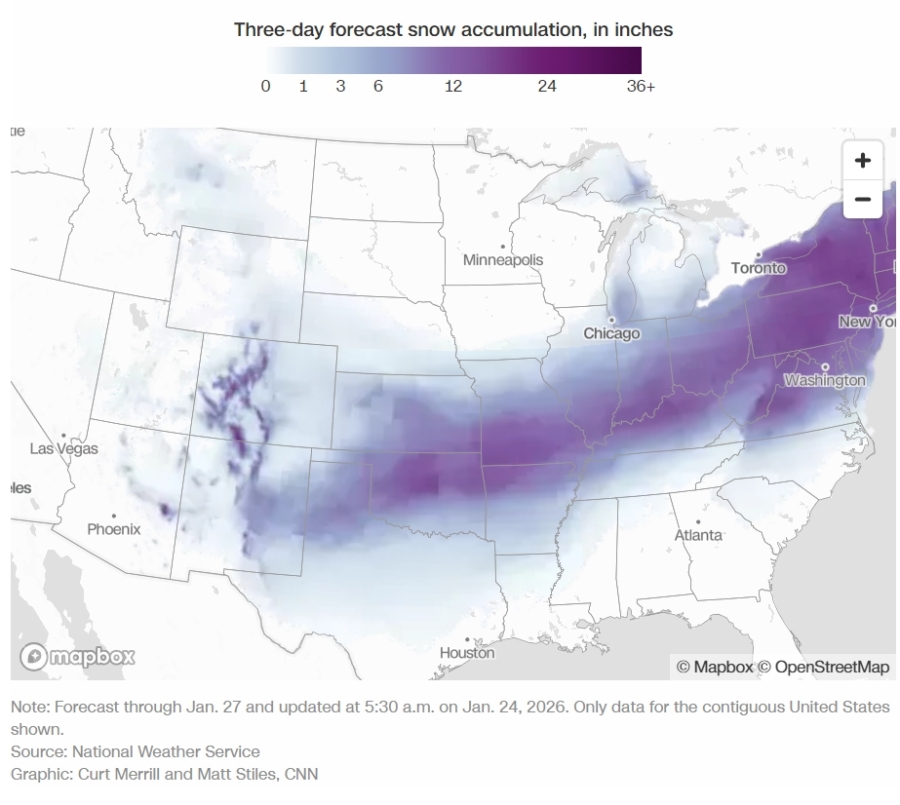 • Widespread threat: Two-thirds of the US population is facing down a monster winter storm and extreme cold. The storm’s snow and ice will stretch over 2,000 miles from Texas to New England as it tracks east through the weekend.