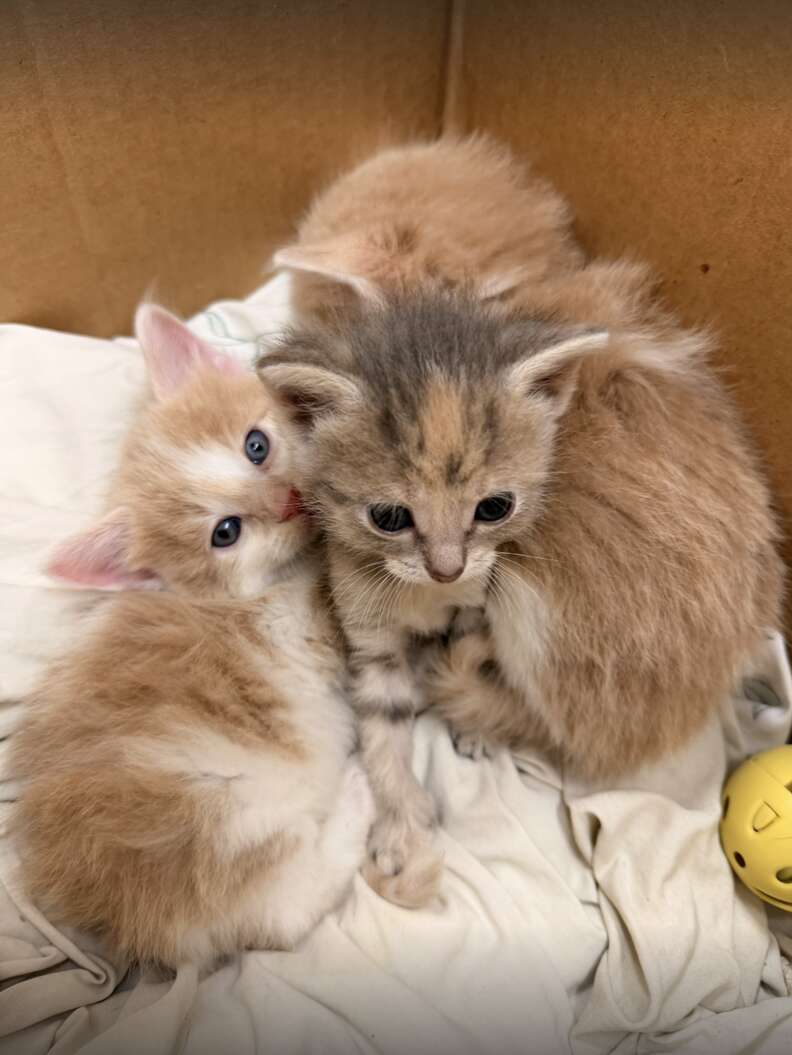 Alarm bells started ringing in the volunteer’s head. She walked over to investigate and noticed that the cardboard box had little air holes punched in it. When she looked in the holes, she could faintly make out two cats staring back at her.