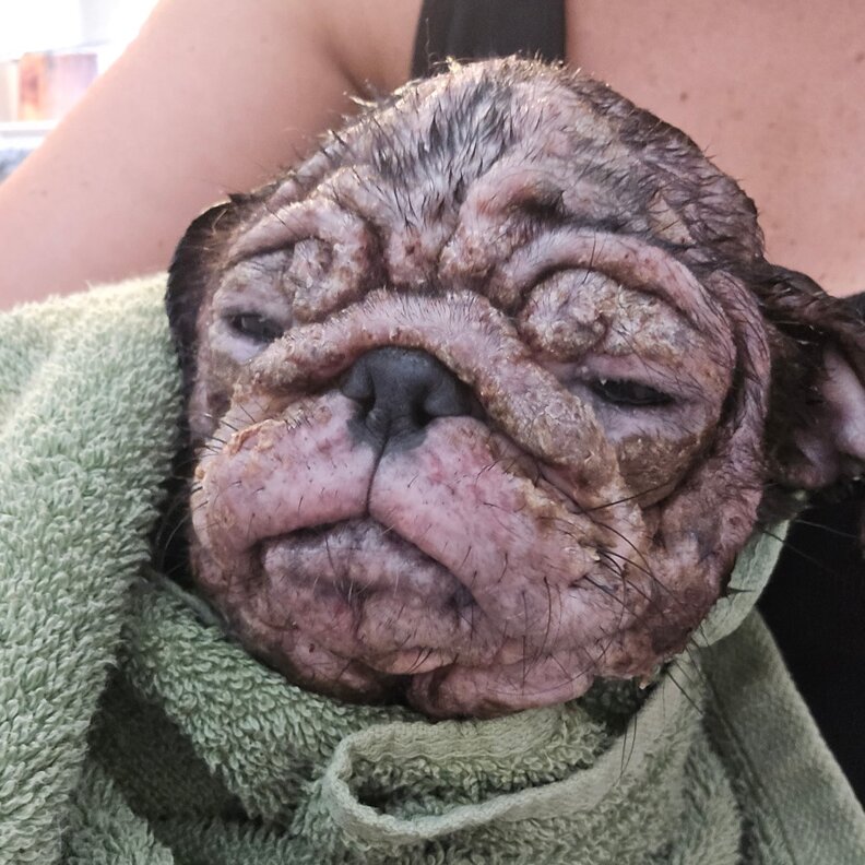 A few months ago, The Animal Foundation (TAF) staff took in a tiny puppy, who instantly broke their hearts. They’d rescued many sick and injured pets in the past, but this 8-pound pug shocked them all when she arrived with no fur and inflamed, red skin.
