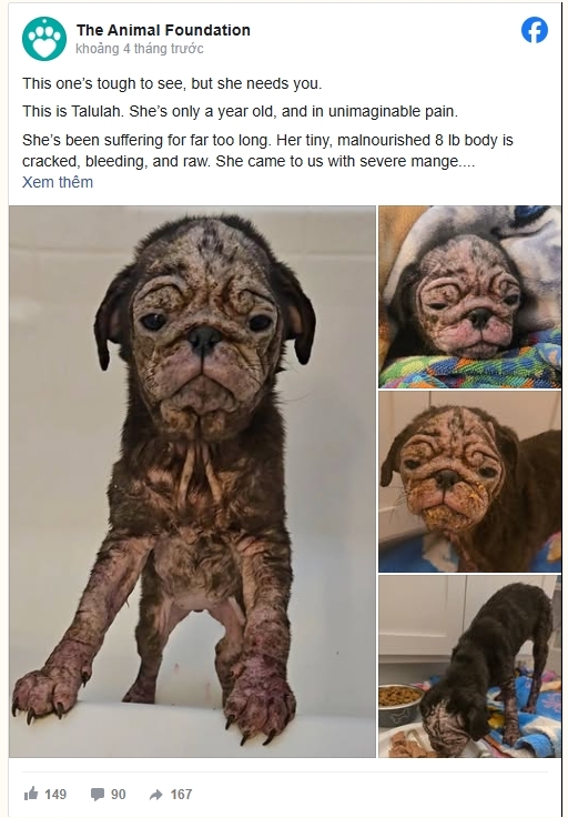 “She’s only a year old, and in unimaginable pain,” TAF wrote on Facebook. “Her tiny, malnourished 8 lb body is cracked, bleeding, and raw.”