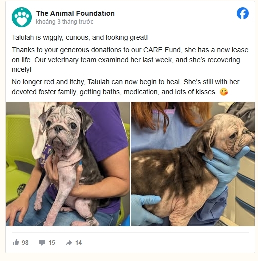 “Talulah is wiggly, curious, and looking great!” TAF wrote on Facebook. “No longer red and itchy, Talulah can now begin to heal. She’s still with her devoted foster family, getting baths, medication, and lots of kisses.”